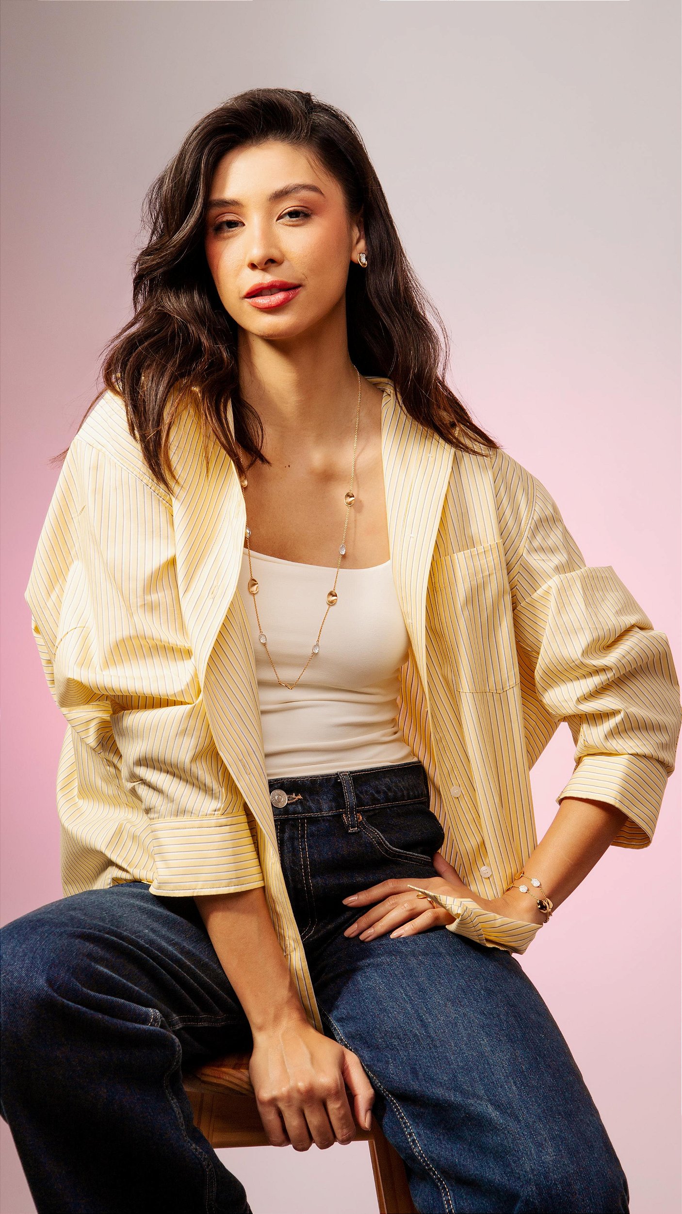 Colar longo com elementos ovais orgânicos e detalhe em zircônias cravejadas.